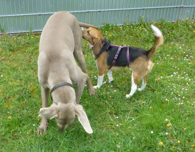 Der Reihe nach: Am frühen Nachmittag haben wir uns außerhalb von Seppls Einzäunung getroffen. Beide, mini Seppl und Genscher, der mindestens viermal so groß und stark ist wie Seppl, lernten sich an der Leine auf einem kleinen gemeinsamen Spaziergang kennen. Seppl war zunächst doch über die imposante Statur von Genscher erstaunt - so Einen hatte er ja noch nie gesehen ...