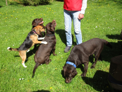 Hier in der Gegend hat sich unter der Hundebevölkerung schon rumgesprochen, dass Seppl alle bespaßt und ein nahezu kostenfreies (außer ein paar Leckerchen) Fitnesstraining anbietet.