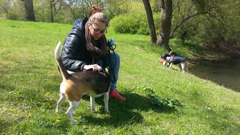 Nach wie vor kauerte sie unbeweglich in ihrem Eckchen. Als ich mit Lucie kam, um sie zum Spaziergang abzuholen, wurde sie aber plötzlich aufgeschlossen und trabte durch die Wohnung. Der Spaziergang verlief wieder super. In belebter urbaner Umgebung hat sie schon immer wieder etwas Angst. An geparkten Autos vorbei- oder gar zwischendurch zu laufen, ist nicht ganz einfach. Geräuschempfindlich ist sie auch. Die Schreckhaftigkeit hält sich aber in Grenzen - panisch kenne ich von meinen früher anders. Sobald man die Straßen hinter sich gelassen und die grüne Weite erreicht hat, merkt man ihr ihre Vergangenheit überhaupt nicht an. Begleithundeprüfung würde sie noch nicht schaffen, aber es ist - sicher mit kleinen Ausnahmen - kein Problem, sie an der Leine in die gewünschte Richtung zu führen. Wenn sie nicht hinten schnüffelt, dann gern möglichst weit voraus, sie läuft schneller als der gewöhnliche Mensch. Aber ohne großen "Druck" lässt sie sich zum Weitergehen, Richtungswechsel usw. bewegen.