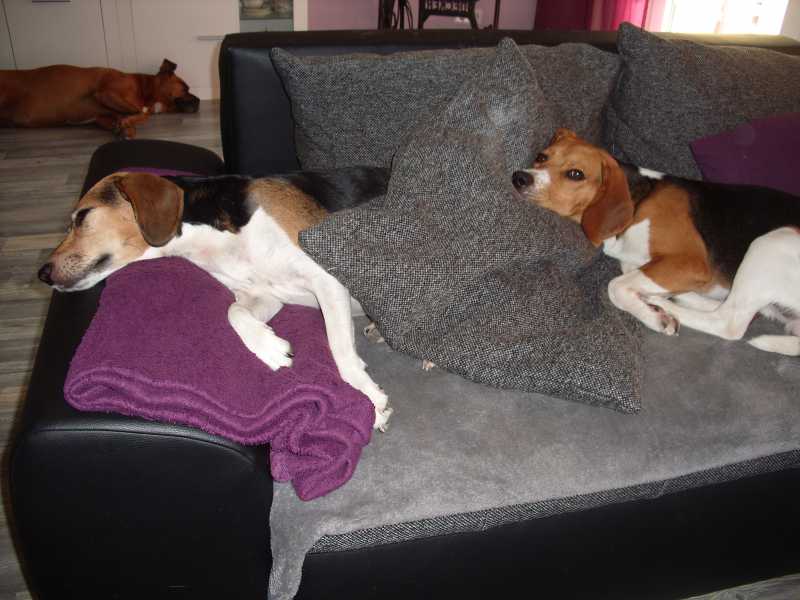 Wir waren heute morgen 1,5 Stunden im Feld und nun liegt er wie erschlagen neben mir. Zur Mittagsruhe hört Miro mit meinen Mädels immer eine Entspannungs CD. Kaum ist die Musik an, dann liegen sie in allen Körbchen verteilt und genießen die Ruhe. Also was uns gut tut, tut auch den Hunden gut. So für heute ist mal schluss, wir müssen jetzt entspannen :)