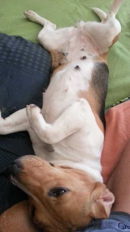Nachdem ich mir in der letzten Nacht das Mädel gegriffen und neben mich aufs Bett (eigentlich Sofa) gesetzt habe, hat sie dort auch die Nacht verbracht. Was sich eigentlich schon vorher andeutete, wurde nun offenbar. Tiffany ist eine Kuschlerin vor dem Herrn, eine wahre Kampfschmuserin. Das Sofa hat sie im Prinzip den ganzen Tag nicht wieder verlassen und sie sucht ständig Körperkontakt. Sie lässt nicht nur alles mit sich machen, sie scheint es absolut zu genießen, wenn man sie streichelt, knuddelt, massiert. Man kann ihr ins Maul fassen, in den Ohren "bohren", Füße und Zehen krabbeln, die Beine "langziehen", usw usf.