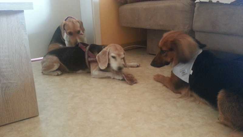 Am Nachmittag kam Tiffany mit zu uns. Sie hat wieder nach kurzem Schnüffeln ihren Platz eingenommen, musste sich dieses Mal aber eine Decke gefallen lassen, die auf ihrem Platz lag. Sie hat einige Mal Lucie kräftig angeknurrt, wenn sie zu nahe kam. Ebenso als sie etwas zum Knabbern hatte, was Lucie magnetisierte. Lucie hat Gott sei Dank verstanden (was ich nicht erwartet hätte