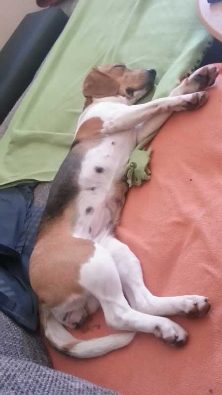 Zu dem Tag kann ich nicht viel sagen. In der PS hat sie mehr oder weniger nur in ihrer Ecke im Flur gelegen. Kam nicht ins Zimmer. Hat in der Wohnung weder mit Hund noch mit Mensch interagiert. Läufigkeit mit Blut hier und dort hat eingesetzt. Fressen und Trinken ja.